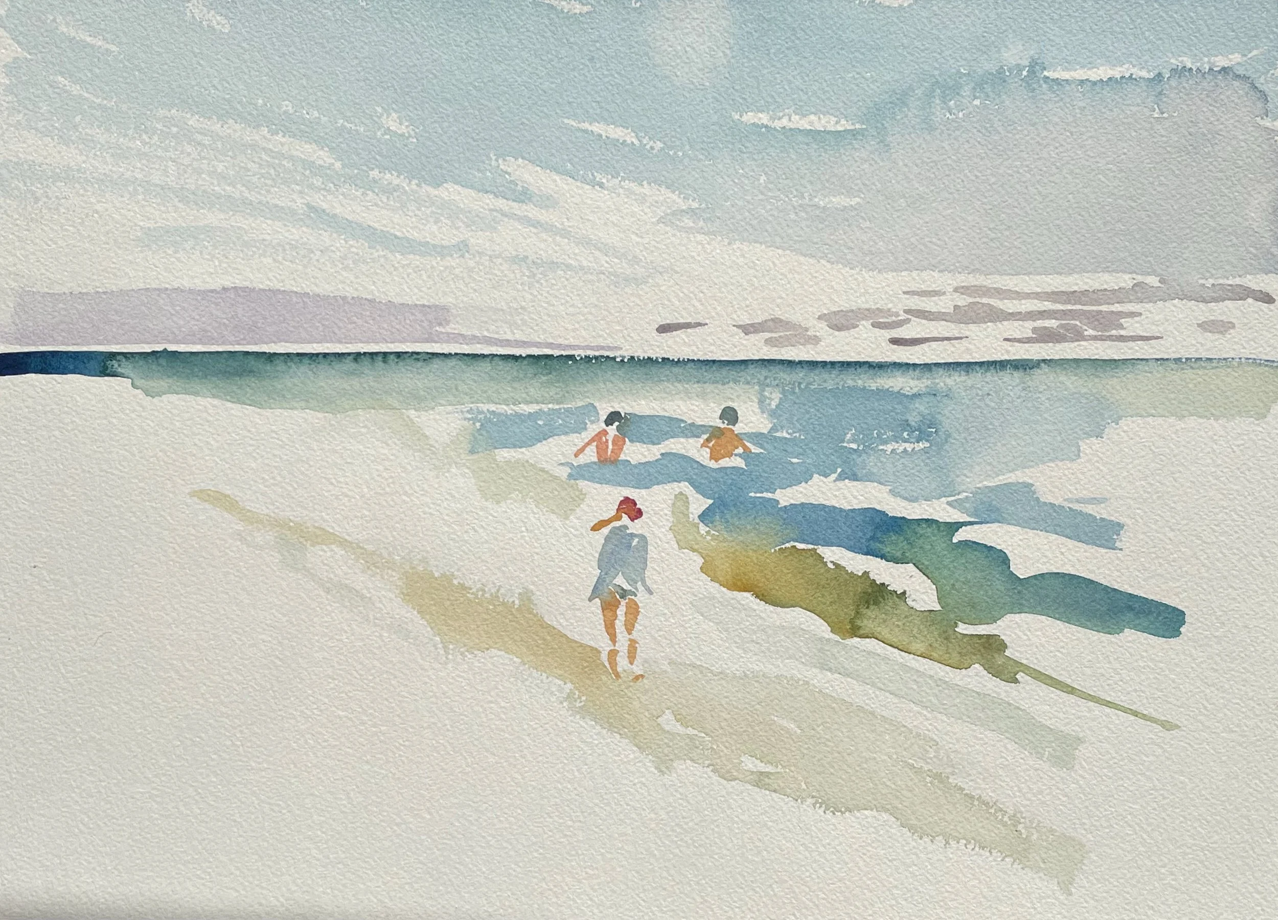 “I catch my breath, breathe in and calm down; feel the salt air. Hear the waves.I find my place on the sand, arrange paper, paints & brushes, and dare to take the first stroke…The sky shifts, the water and waves move, people and gulls pass by, the light changes…I’m in Kairos: the powers that be and I are collaborating.”